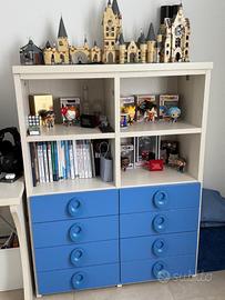 âś… Libreria coordinata: mobile a giorno con ben 8 cassetti blu nella parte inferiore.