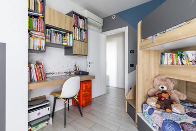 • Zona studio completa: Piano scrivania sospeso (salvaspazio) con una libreria modello Infinity nei colori grigio titanio e ciliegio nordico. Ideale per studiare e organizzare libri e oggetti.