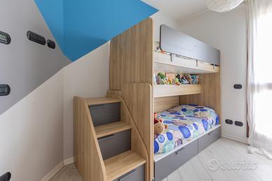 • Letti scorrevoli: modello Sprint, un'ottima soluzione per avere due letti in uno spazio ridotto, completo di scaletta laterale. Il letto inferiore scorre facilmente. I colori sono in coordinato con la libreria: grigio titanio e ciliegio nordico.