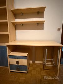Vendo cameretta completa a ponte, marca Colombini (garanzia di qualità e robustezza). Finitura faggio chiaro con originali ante e frontali texture blu effetto jeans. Composizione funzionale e salvaspazio: • Grande Armadio a Ponte: 4 ante battenti con ripiani centrali a giorno e aste appendiabiti. • Letto Singolo a Divanetto: Con robusta rete a doghe in legno inclusa. • Doppio Cassettone Sottolestto: Ampi e pratici per riporre tutto. • Zona Studio: Scrivania con supporto PC e cassettiera su ruote (3 cassetti). Libreria a Colonna: 5 ripiani a giorno. • Coppia Mensole: Coordinate, con supporti satinati. Dettagli e Prezzo: • Condizioni: Usata in buone condizioni generali, con normali e lievi segni di usura del tempo (come da foto) che non ne compromettono l'estetica o la funzionalità. • Prezzo: € 1000 • Ritiro: A carico dell'acquirente a Torino. Lla vendo a una frazione del prezzo! Una soluzione di alta qualità al costo di un mobile economico.