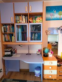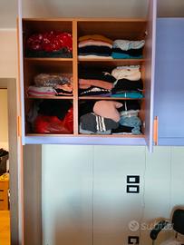 cameretta completa per bambini altezza 260 struttura in colore ciliegio e ante colorate lilla, composta da: