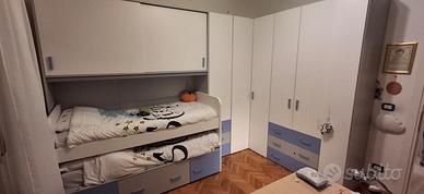 Causa Ristrutturazione vendo Cameretta completa componibile, compresa di struttura letti e materassi sfoderabili. Dotata di scaffali interni e di appendi abiti. Cassetti grandi e piccoli e vani capienti sotto il letto. La struttura del letto inferiore ha le ruote che consentono una facile movimentazione. Può essere montata angolare o lineare.