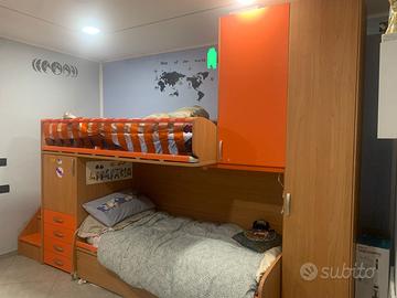 Vendo cameretta con 3 letti. Lunghezza 3.70m Altezza 2.58m Profondità della scala 1.35m Compreso un Armadio singolo, larghezza 1m Profondità 60cm Altezza 2.58m Smontaggio e trasporto a carico dell’acquirente. Prezzo trattabile