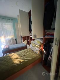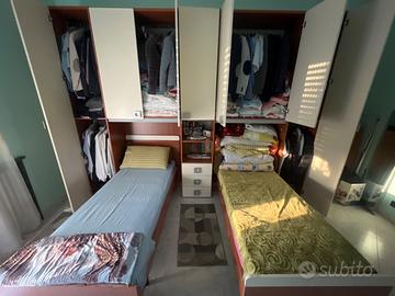 Vendesi cameretta completa in ottime condizioni, ideale per arredare con funzionalità e stile la stanza dei ragazzi. La soluzione comprende due letti singoli con armadiatura a ponte e vani contenitori, ottimizzando al massimo lo spazio.