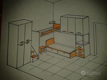 Cameretta completa con due letti con rete, comodino, armadio molto capiente, soppalco con passerella e contenitore, due cassettoni contenitori sotto al letto di sotto. Tenuta molto bene. Si trova a Collesalvetti (LI), ritiro in loco, per lo smontaggio vi diamo una mano, trasporto a carico dell'acquirente.
