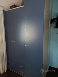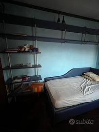 Vendo cameretta completa in ottime condizioni, composta da: •Armadio a tre ante con cassetti inferiori e maniglie in metallo; •Letto singolo imbottito con struttura blu e secondo materasso con struttura apribile per rendere il letto matrimoniale; •Scrivania con cassettiera e sedia girevole blu; •Libreria a giorno con ripiani blu e montanti in metallo; •Ulteriore libreria a parete coordinata con ripiani spaziosi. Il set è coordinato nei colori blu, robusto e ben tenuto, ideale per camerette ragazzi o spazi studio. ✅ Tutto in buono stato. 📍 Ritiro a carico del cliente. 🔧 Su richiesta possiamo occuparci noi dello smontaggio. 💶 Prezzo trattabile se l’acquirente provvede autonomamente allo smontaggio.