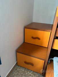 Descrizione Vendo cameretta completa marca Giessegi in ottime condizioni, robusta e funzionale, ideale per bambini o ragazzi. Struttura solida con molti spazi contenitivi. La cameretta è composta da: • Letto a castello con struttura contenitore Dimensioni: 200 × 110 × 92,5 cm Materasso: 190 × 80 cm Dotato di 6 cassettoni capienti sotto il letto. Materasso incluso • 2 scrivanie estraibili integrate nella struttura del letto. • Gradini contenitore con cassetto Larghezza gradini: 50 cm. • Armadio a 4 ante con cassetti inferiori Dimensioni: 181 × 90 × 47 cm. • Comodino Dimensioni: 51 × 57 × 42,5 cm. • Scrivania curva con cassettiera integrata Dimensioni: 130 × 75 × 60 cm. La cameretta è stata acquistata nuova ed è stata utilizzata con cura. Tutti i mobili sono in buone condizioni e perfettamente funzionanti. Colore legno chiaro / ciliegio con elementi arancio. Vendita completa. Smontaggio e trasporto a carico dell’acquirente. Per qualsiasi informazione o per altre foto scrivetemi.