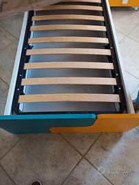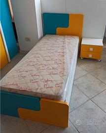 L'armadio è dotato di 3 ante battenti a cui è stato aggiunto una libreria con 4 mensole e lateralmente un'ultima anta che funge da scarpiera.L.193 H.226.3 P.57.8. Il letto contenitore Tetris presenta testata e pediera con 2 pannelli. L.198 H.95 P.95. il comodino presenta 2 capienti cassetti e le ruote. L.45 H.41.6 P.40. Scrivania L.150 H.75 P.60 con cassettiera 3 cassetti e piede a "C". Elemento sospeso con mensole L.42.4 P.25.8 H.29.4. Sedia girevole pixy.Materasso incluso. Possibile concordare trasporto e montaggio.