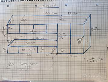 Per sgombero appartamento, vendo arredo cameretta in legno, prodotto artigianale con molti ripiani profondi, cassettiera, guardaroba, letto a incasso con cassettoni. Nell'ultima foto sono riportate più misure possibili: - lunghezza massima: 300 m - altezza: 280 cm - profondità armadio con guardaroba: 80 cm - profondità interna dell'armadio con guardaroba: 54 cm - lunghezza spazio letto: 187 cm - profondità vano letto: 82,5 cm - altezza letto (senza materasso): 35 cm - profondità comprensiva del letto: 88 cm - profondità cassettoni sotto-letto: 66 cm Per offerte o domande, contattatemi qui sull'app di Subito. Smontaggio e trasporto a carico dell'acquirente.