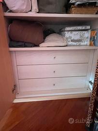 Cameretta completa comprensiva di scrivania, mobile a vista, mensole, armadio con cassettiera, letto con rivestimento parete.