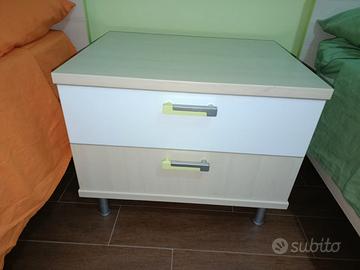 La cameretta comprende - 2 lettini - 2 reti con doghe - 1 comodino - 1 settimino - 1 armadio a 3 ante con cassettiera in regalo un lampadario
