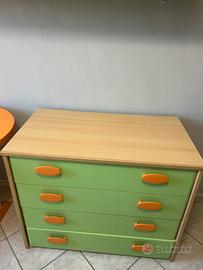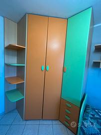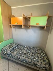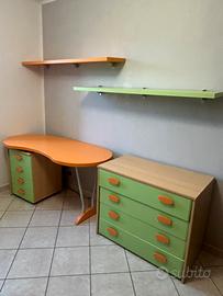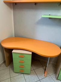Vendo cameretta completa di qualità per bambini/ragazzi nei colori arancione, verde mela e legno chiaro. I mobili sono robusti, funzionali e ideali per arredare una stanza intera con un unico stile vivace. La cameretta è composta dai seguenti elementi: • Armadio Angolare Capiente: Composto da un modulo a due ante, un modulo a un’anta con cassettiera esterna integrata a 4 cassetti e una colonna terminale a giorno con ripiani curvi.• Letto Singolo: Struttura solida con base in metallo per la massima stabilità e testata sagomate color verde mela .• Zona Studio: Scrivania con piano sagomato ergonomico color arancione e gamba metallica satinata. Cassettiera sotto-scrivania rimovibile dotata di comode rotelle per essere spostata facilmente in base alle necessità.• Sistemi a Parete: 2 Mensole lineari lunghe e 2 Pensili a giorno con anta a ribalta e dettaglio decorativo sottostante. I mobili sono in ottime condizioni generali, smontaggio e trasporto a carico dell’acquirente. scrivimi in privato per info e foto
