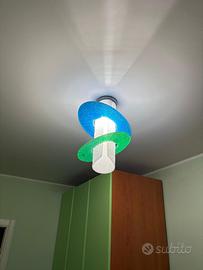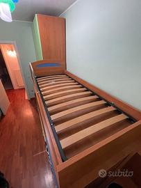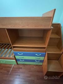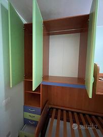 Cameretta a ponte con due letti e armadio. Cameretta completa in legno laminato color ciliegio, verde e blu. Compatta e utile per stanze piccole Comprende armadio, due letti singoli (uno estraibile), scala contenitore e scrivania integrata. Misure circa L 350 x H 260 x P 100 cm. In ottime condizioni, solida e spaziosa. Lampadario incluso nel prezzo. Gia smontata da ditta specializzata, spese incluse nel prezzo di vendita. Spedizione solo con pagamento anticipato