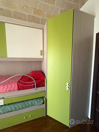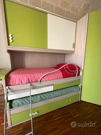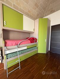 Vendo splendida cameretta completa per bambini/ragazzi, una soluzione estremamente funzionale e salvaspazio che offre ben tre posti letto, capienti armadiature e pratiche postazioni studio, tutto in un design moderno e vivace.