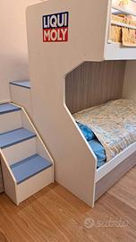Cameretta completa per bambini con 2 letti dei quali uno a castello, scaletta contenitore, passaggio letto contenitore, scrivania, libreria, armadio ad angolo molto capiente. Colori: beige, bianco e glicine.