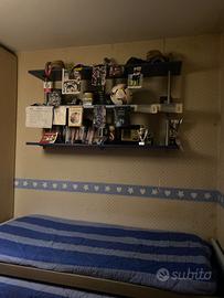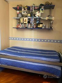 Vendo cameretta completa per ragazzi, in ottime condizioni, dal design moderno nei toni del blu e grigio. La composizione include: * Letto singolo con secondo letto estraibile (ideale per ospiti) * Ampio armadio angolare molto capiente * Scrivania spaziosa con cassettiera * Pensili e mensole a parete * Libreria angolare con ripiani Cameretta pratica e funzionale, perfetta per ottimizzare gli spazi grazie alla disposizione ad angolo e ai numerosi vani contenitore. Completa anche di zona studio, ideale per bambini e ragazzi. La struttura è solida, ben tenuta e pronta all’uso.