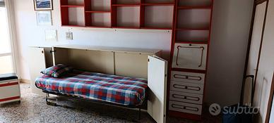 Cameretta composta da letto cassettiera puf e scaffalatura componibile.Si trova a Pisa in condominio con ascensore
