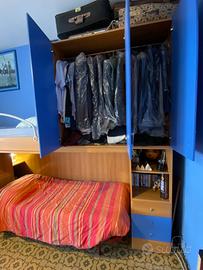 Cameretta soppalco con letto a castello, composta da scala contenitore (54cm), colonna (45cm), due ante medie, scrivania scorrevole con cassettiera (90cm) e due letti singoli con la possibilità di aggiungere il terzo.