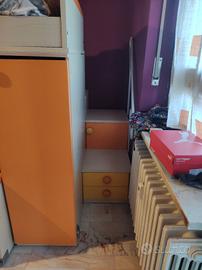 cameretta completa a soppalco con 2 letti ,passerella con botola portatutto,piumonii ,coperte , peluche,scalini porta lenzuola pigiami ecc. ecc.. scrivania + colonna libreria multiuso. Vendo causa cambio utilizzo della stanza.