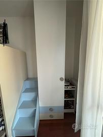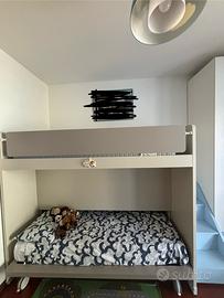 Cameretta acquistata da Perbellini Arredamenti di Verona. Composta da: letto a castello salvaspazio scorrevole/estraibile con pedana a scomparsa, letto inferiore con ruote, scaletta con botole porta-oggetti in ogni gradino, armadio anta singola (misure 60x250) con due cassetti inferiori, armadio doppia anta (90x250) con due cassetti inferiori. Tutte le ante e cassetti sono a chiusura rallentata, qualità e resistenza ottima.
