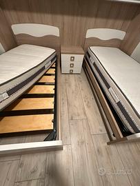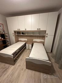 Vendo cameretta completa con due letti da una piazza, con materassi 190x80, reti in doghe, armadio a ponte molto spazioso e comodino centrale. Tutto come nuovo, usato pochissimo. Misure armadio cm L 350 cm H 260 cm P 58