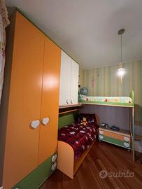 Camera per 3 bambini/ragazzi costituita da: scrivania due posti; cabina armadio spaziosa con cassettiera, due piani di mensole e appendi abiti. Due armadi a doppia anta con appendiabiti e mensole, specchiera. Letto a soppalco e letto singolo con letto aggiuntivo. Tre cassettiere e due comodini tutti corredati da maniglie fantasiose. Cubi portalibri 3, e mensole colorate 2; Fianchi degli armadi corredati da mensole colorate.