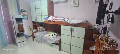Cameretta con 2 letti completi ed uno a scomparsa, con doppio armadio uno sotto al letto rialzato ed uno a sx del letto sotto.