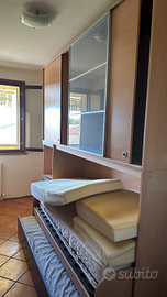 Armadio con 3 ante scorrevoli al di sopra. Cassetto e mensola. Letto sopra con rete ma senza materasso. E cassettone scorrevole con rete.