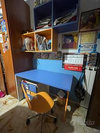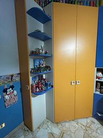 Cameretta con cabina armadio di colore arancione blu con letti a castello .