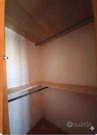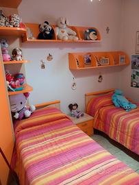 Vendo cameretta con cabina armadio contenente due mensole e due aste appendiabiti, comodino, scrittoio completo di sedia pieghevole con struttura in plastica pesante e struttura in metallo, libreria, mensole e un altro piccolo mobiletto con due vani a giorno e due chiusi con anta che si appende al muro. attaccata alla cabina armadio c'è un modulo con 6 mensole( nella foto le mensole sono 4 perchè 2 sono state tolte per inserire il letto). I lettino non sono inclusi nel letto perchè presentano imperfezioni dovute all'utilizzo ma che posso regalare se vi interessano. Il colore della cameretta è arancione e faggio chiaro.