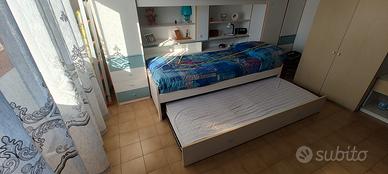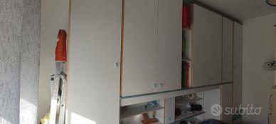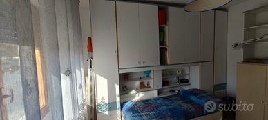 Vendo cameretta con armadio a ponte con 5 ante componibili. Il secondo letto inserito sotto, si alza alla stessa altezza del primo. Larghezza 3,38m Altezza 2,69m