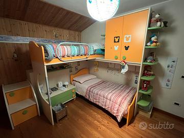 Cameretta (Moretti Compact) con due letti a castello e armadio a ponte, comodino-cassettiera, cassettiera grande e armadio completa di mensole e doghe (esclusi solo i materassi). Ottima fattura, prodotta da azienda italiana circa 12 anni fa.