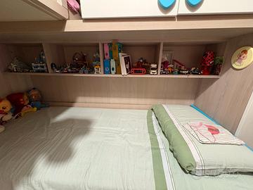 2 letti a castello, 2 pensili + 1 colonna armadio, cassettiera con 3 cassetti, comodino con 2 cassetti, 3 scalini contenitore e 1 botola portaoggetti