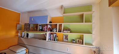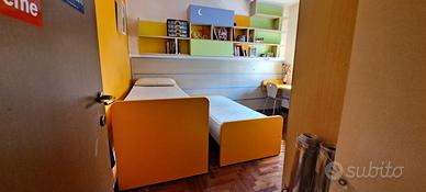 Due letti e una scrivania che scorrono su un pannello (con delle guide) applicato al muro. Un letto rimane sotto l’altro.
