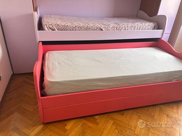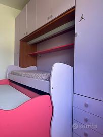 cameretta per bambine/ragazze con letto a castello. 4 armadi 1 mensola e cassetti per intimo + contenitori sotto al letto basso