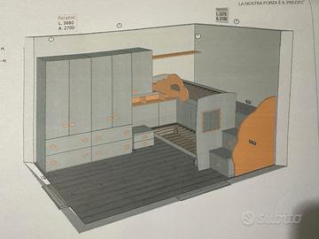 Vendo cameretta fuori standard da bambini acquistata Dicembre 2022 e smontata da inizio anno causa trasloco e cambio camera. La camera è composta da armadio diviso in due zone da due ante ciascuna, con sottostanti due cassettoni, oltre ad anta alta sopra il comodino. Il letto basso ha le ruote, così come il comodino, utile per rifare il letto e le pulizie. Al letto superiore, si accede tramite scala costituita da cassetti e "disimpegno" sul retro per una maggiore sicurezza, anch'esso costituito da cassetti (contenitore). Entrambi i letti sono datati di mensola a tutta larghezza. Vendo con materasso preso a parte da posizionare nel lettino di sopra (per dimensioni), in memory e micro molle, pagato 700€ solo quello e mai utilizzato in quanto avevo un solo figlio). Comoda soluzione anche da utilizzare come letto nella parte superiore e zona scrivania/TV sotto. Tutto già smontato e disponibile da subito ad Asciano. L'armadio è possibile installarlo separatamente dalla struttura letto, inserendo un semplice pannello laterale. Possibilità di fornire recapito di un montatore specializzato in queste camerette.