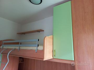 Composizione con 2 letti a castello e cassettone, armadio 3 ante con cassetti. Altezza massima metri 2,60, profondità cm 93, lunghezza metri 3,00. In buono stato. Smontaggio e ritiro a carico dell'acquirente. Zona Tarquinia. Euro 330