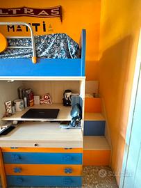 Cameretta bicolore (azzurro,arancione) con effetto legno chiaro, composta da armadio a due ante piu due sportelli con letto soppalcato più un'altro letto al livello inferiore e piccolo scrittoio