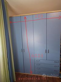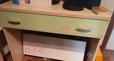 Vendo cameretta per bambini, con letto a castello ad angolo con cassettiera a scalini+pedana, comodino+ armadio e scrivania, il tutto con colori abbinati