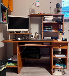 Scrivania altezza cm 135, lunghezza cm 140, profondità cm 70 , dotata di rialzo per pc, carrello per tastiera, cassetti e mensole