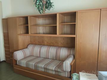 In legno color olmo, buone condizioni, integrabile con altri pezzi e secondo letto di altro annuncio (FOTO 5 E 6). Il letto (e sovrastante libreria) è lungo 2 metri con cassettiera o eventuale letto estraibile sottostante, la libreria e il mobile con scrivania a ribalta cm 90 cadauno, per un totale di 3,80. Possibilità di trasporto e assistenza al montaggio.