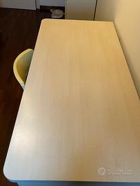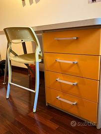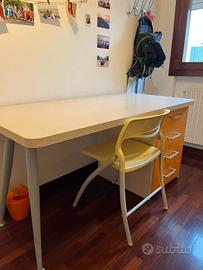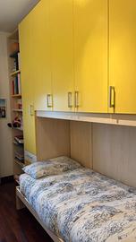 Cameretta con letto singolo, armadio a ponte e scrivania con sedia e cassettiera.