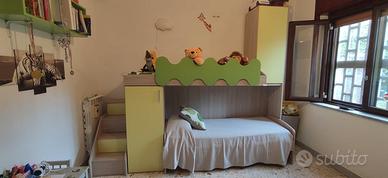 Cameretta bambini con tre lettini di misure regolari, colori verde mela e verde prato.