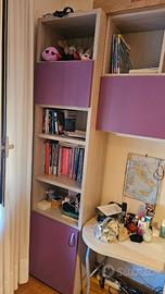 Cameretta per ragazzi; contenitore a colonna con sportelli e scaffali; scrivania con estensione