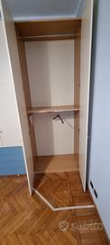 Vendo Cameretta Crema Azzurro, anni 2000, acquistata dal mobiliere (NON GRANDI MAGAZZINI) ARMADIO 4 ante più 1 ad angolo, 4 cassetti esterni all'anta, 3 tubi e 5 mensole nell'anta ad angolo, 1 mensola nel blocco centrale.