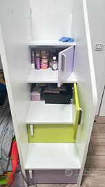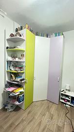 Vendo cameretta a soppalco acquistata 4 anni fa, composta da 2 letti a castello e 1 estraibile armadio ad angolo. Materassi esclusi. Le misure vedi foto. Trasporto e montaggio a carico vostro.