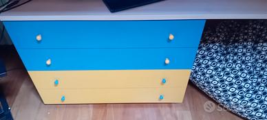 Cameretta unisex componibile a piacere composta da letto a castello con letto sotto movibile,(lung.cm 200),scaletta fissa(larg 54cm)totale con letto cm 255 x 135cm,2 comodini 37x45cm,n 2 armadi da 2 ante con appendiabiti e ripiano(h 164x90cm),n 2 librerie(128x30cm e 96x30cm),mobiletto a due ante(70x90cm)e cassettiera(4 cassetti 70x90cm).La passerella del letto superiore ha due contenitori porta coperte, giochi.La sponda del letto sopra si toglie con apposita chiavetta per facilitare il rimbocco delle coperte.Il letto sotto ha le doghe. Compresi i 2 materassi.Il prezzo è trattabile