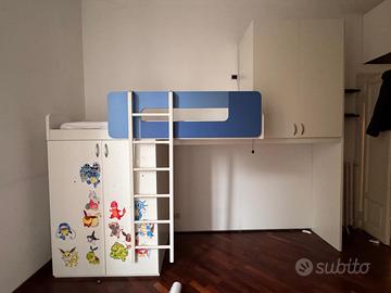 Cameretta da bambino marca "Mondo Camerette", lunghezza 3,08m x altezza complessiva 2,59m e profondità massima 90cm. La struttura è bianca, maniglie grige satinate, e barra blu mare. La cameretta ha 5 anni, è in buono stato e viene venduta vista e piaciuta, già smontata e ritirabile presso deposito sito in Rogoredo.
