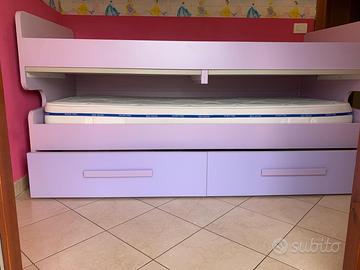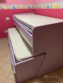 Doppio letto scorrevole compreso di reti e materassi con doppia scrivania estraibile e 2 cassettoni estraibili.