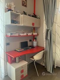 •Scrivania angolare rossa con cassettiera, mensole e pensile